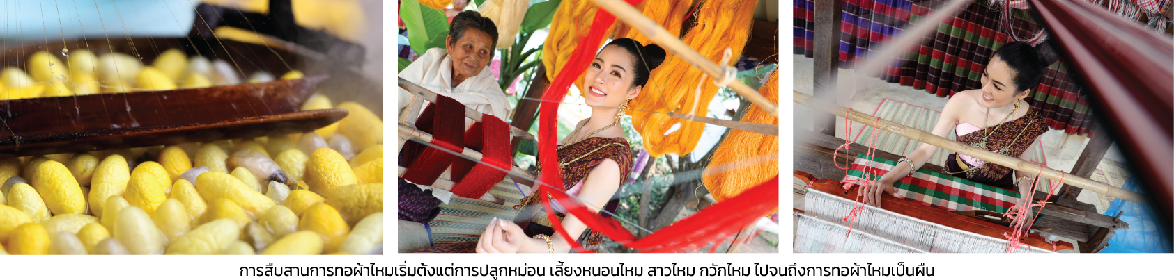 หลังจากรับประทานอาหารว่างและ Welcome Drink น้ำลูกหม่อนและชาใบหม่อน เมื่อมาถึงเรียบร้อยแล้ว จะได้ชมการผลิต การค้า และพัฒนาผลิตภัณฑ์ผ้าไหม ผ้ามัดหมี่ ก่อนที่จะเดินทางไป ศาลาไหมไทย หรือ "อาคารเฉลิมพระเกียรติ 60 พรรษา มหาราชินี" ภายในจัดแสดงกรรมวิธีการผลิตตั้งแต่มัดย้อมจนถึงวิธีการทอ อุปกรณ์เครื่องใช้เกี่ยวกับไหมและของเก่าแก่ รวมถึงผ้าไหมมัดหมี่โบราณ พร้อมผ้าไหมมัดหมี่ที่ชนะการประกวดต่าง ๆ ตลอดจนการทำผ้าไหมนาโน จากนั้นร่วมรับประทานอาหารพื้นถิ่นที่เป็นผลผลิตจากการปลูกหม่อนเลี้ยงไหม เช่น ดักแด้ทอด ลาบดักแด้ รวมถึงอาหารที่ใช้ชาใบหม่อนเป็นวัตถุดิบหลัก เป็นต้น แล้วไปเดินย่อยกันที่ ถนนสายไหม เพื่อให้ทุกท่านเลือกซื้อ ผ้าไหม สินค้าคุณภาพ ลวดลายสีสันงดงามมาตรฐาน ตรานกยูงพระราชทาน
