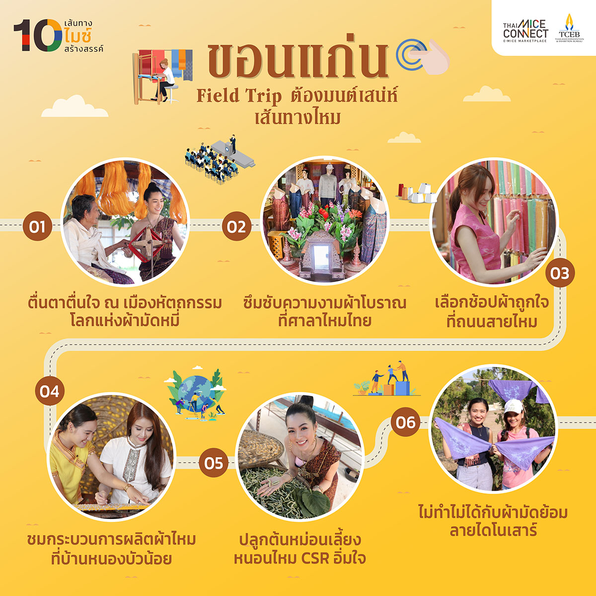 ล่าสุดจากโครงการ “10 เส้นทางไมซ์สร้างสรรค์” ของ Thai MICE Connect สมาคมธุรกิจการท่องเที่ยวจังหวัดขอนแก่น ได้ออกแบบเส้นทางไมซ์ ขอนแก่น : Field Trip ต้องมนต์เสน่ห์เส้นทางไหม ที่จะนำพาองค์กรไปศึกษาดูงานการทอผ้าไหม งานหัตถศิลป์สำคัญของเมืองมัดหมี่โลกแห่งนี้ ซึ่งถือเป็นมรดกภูมิปัญญาถ่ายทอดจากรุ่นสู่รุ่นเป็นเวลากว่าร้อยปี มนต์เสน่ห์ของวิถีชีวิตของชุมชนต่าง ๆ จะทำให้ทุกคนต้องทึ่งกับความสามารถของชาวบ้าน ผู้เฒ่าผู้แก่ ที่ยังคงใช้เวลาอยู่กับกี่ทอผ้าโบราณ ได้เรียนรู้อุตสาหกรรมผ้าไหมขนาดย่อมตั้งแต่ต้นน้ำถึงปลายน้ำ หรือแม้แต่การปลูกหม่อนเลี้ยงไหมแบบที่เคยได้ยินกันมาว่าจะหน้าตาเป็นอย่างไร? พลาดไม่ได้เลยกับการตามรอยเส้นทางผ้าไหมและผ้ามัดหมี่ในจังหวัดขอนแก่น