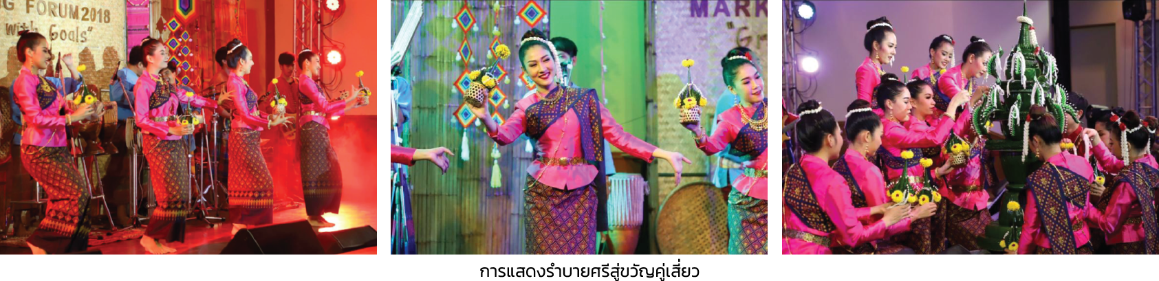 จากนั้นเดินทางกลับที่พัก ณ โรงแรมราชาวดี รีสอร์ต แอนด์ โฮเต็ล ซึ่งครบครันไปด้วยสิ่งอำนวยความสะดวกเพื่อการประชุมและเข้าพัก โดยได้รับการรับรองมาตรฐาน Thailand MICE Standard รับประทานอาหารพื้นถิ่นอีสาน และอาหารขึ้นชื่อของจังหวัดขอนแก่น เช่น ไก่ย่างเขาสวนกวาง ไข่มดแดง และอื่น ๆ เป็นต้น ซึ่งระหว่างการรับประทานเย็นนี้เองจะมีกิจกรรมการ รำบายศรีสู่ขวัญคู่เสี่ยว ซึ่งถือเป็นประเพณีเก่าแก่และสำคัญของชาวอีสาน เชิญชวนให้ผู้ที่ทำธุรกิจร่วมกัน หรือ Business Matching กันแล้วมาผูกเสี่ยวกัน ชมความงดงามอ่อนช้อยของนางรำ พร้อมนำด้ายสายสิญจน์ในพิธีไปผูกแขนให้ผู้ชมเป็นการร่วมกิจกรรมปิดท้าย