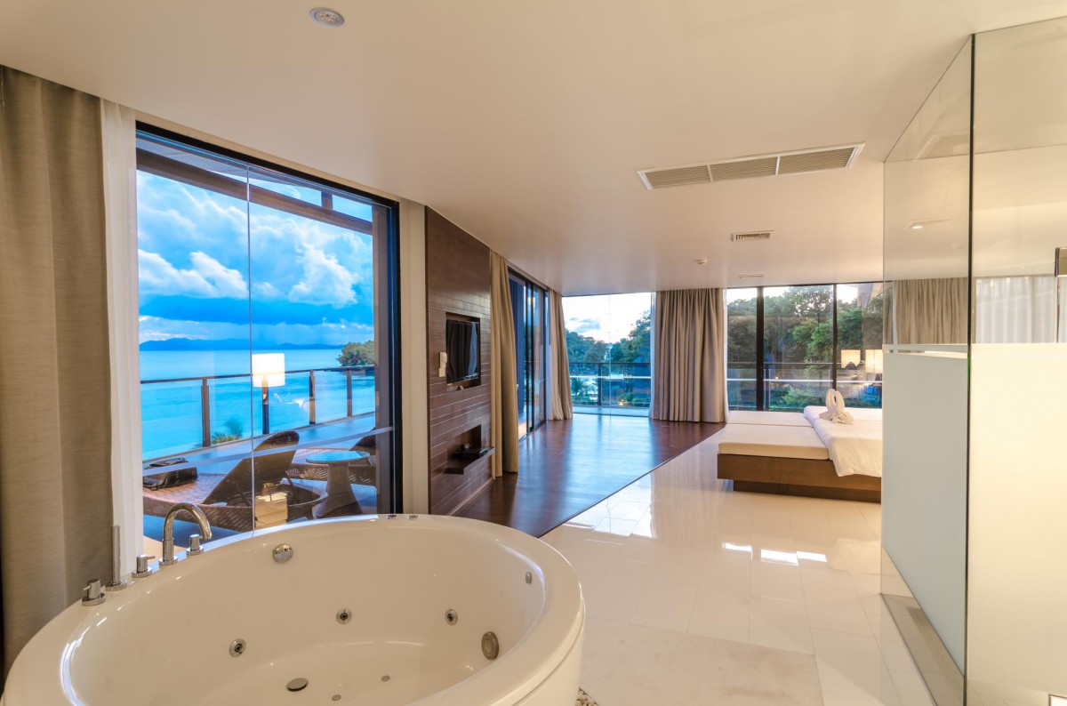เช็คอินที่ล็อบบี้ชั้น 5 และเพลิดเพลินกับทัศนียภาพอันงดงามตระการตาของมหาสมุทรอันดามันที่เรียงรายไปด้วยหอคอยหินปูนที่มีชื่อเสียงของกระบี่