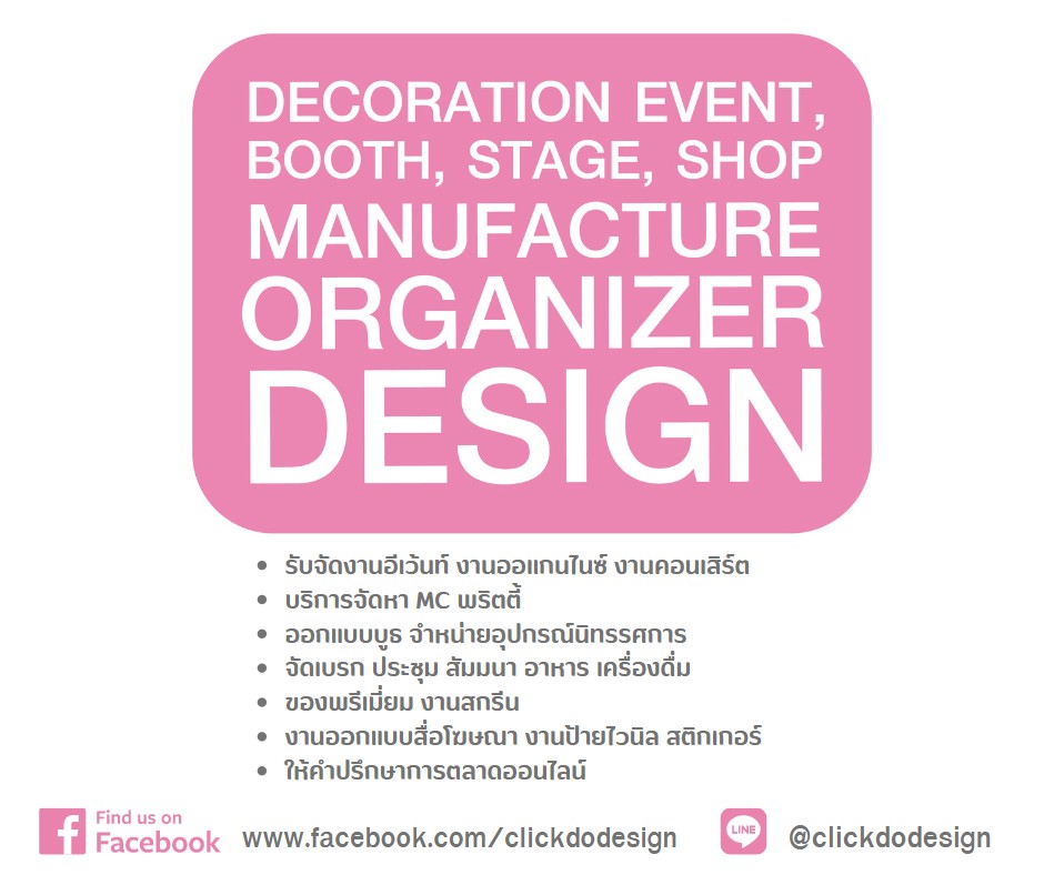 คลิกดูดีไซน์ รับผลิตสื่อสิ่งพิมพ์ทุกชนิด ออกแบบบูธ อุปกรณ์นิทรรศการ ออแกนไนซ์ อีเว้นท์ พริตตี้ MC รับทำป้ายคัทเอาท์ ไวนิล งานสติ๊กเกอร์ ฝ้า ซีทรู กล่องไฟ ป้ายตัวอักษร งานดี งานคุณภาพ แสง สี เสียง ยินดีให้บริการ