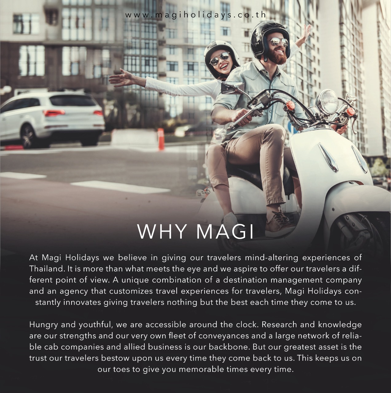 Magi Holidays is a premium brand involved in all travel related services with head Office in Bangkok, we believe in giving our travelers mind altering experiences of Thailand. It is more than what meets the eye and we aspire to offer our traveler a different point of view. A unique combination of a destination management company and an agency that customizes travel experiences for the travelers, Magi Holidays constantly innovates giving the travelers nothing but the best each time they come to us.