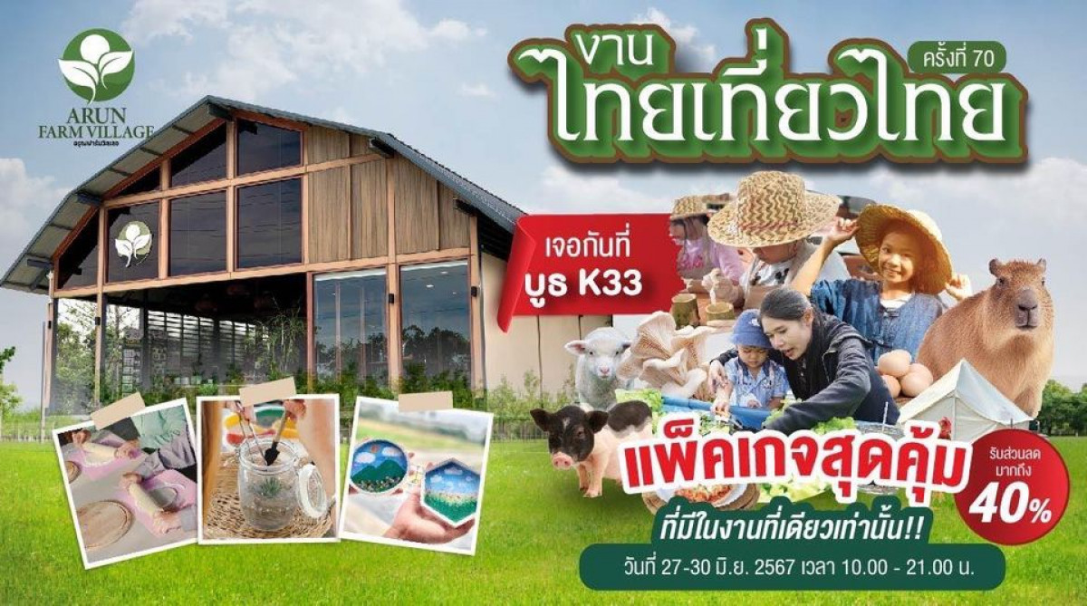 พิเศษสุดพบกับ อรุณฟาร์มวิลเลจ ในงานไทยเที่ยวไทย ภายในวันที่ 27 -30 มิ.ย. 67 ร่วมท่องเที่ยวเชิงเกษตรไปด้วยกัน