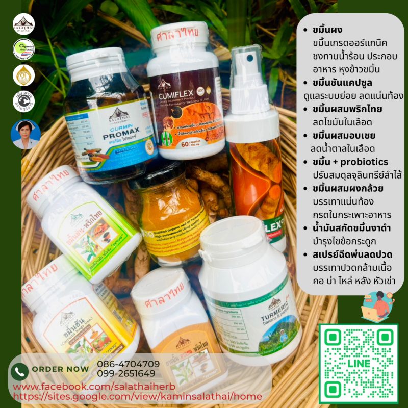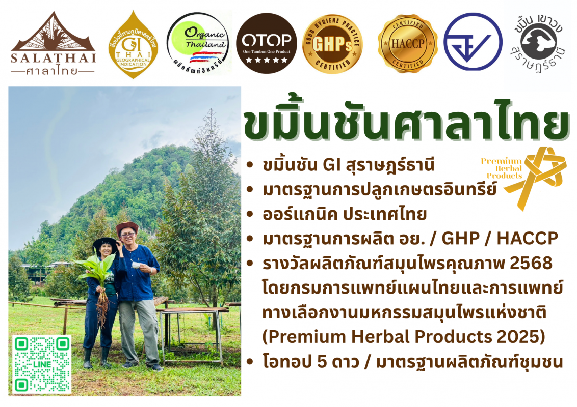 ขมิ้นชันศาลาไทย เราเชื่อมั่นในพลังการเยียวยาจากธรรมชาติ เราจึงรังสรรค์ผลิตภัณฑ์จากขมิ้นชัน GI เพื่อส่งเสริมสุขภาพและความงามตามธรรมชาติจากภายใน ขมิ้นชันของเราปลูกใน ต. เขาวง บ้านตาขุน จ.สุราษฎร์ธานี ได้รับการรับรอง สิ่งบ่งชี้ทางภูมิศาสตร์ (GI) ปี 2568 ปลูกแบบเกษตรอินทรีย์ และได้รับการยอมรับจากงานวิจัยชั้นนำของไทยว่าเป็นหนึ่งในขมิ้นชันที่ดีที่สุดของประเทศ เราภูมิใจที่ผลิตภัณฑ์ของเราผ่านมาตรฐาน อย. (FDA) ไทย, OTOP 5 ดาว, GHPs, HACCP, และ GMP ผลิตภัณฑ์ของเราได้รับการพัฒนาอย่างพิถีพิถันโดยแบ่งเป็น 3 หมวดหมู่หลัก ได้แก่ ผลิตภัณฑ์ดูแลผิว, ผลิตภัณฑ์เสริมอาหาร, และน้ำมัน/บาล์มสำหรับผ่อนคลายกล้ามเนื้อ