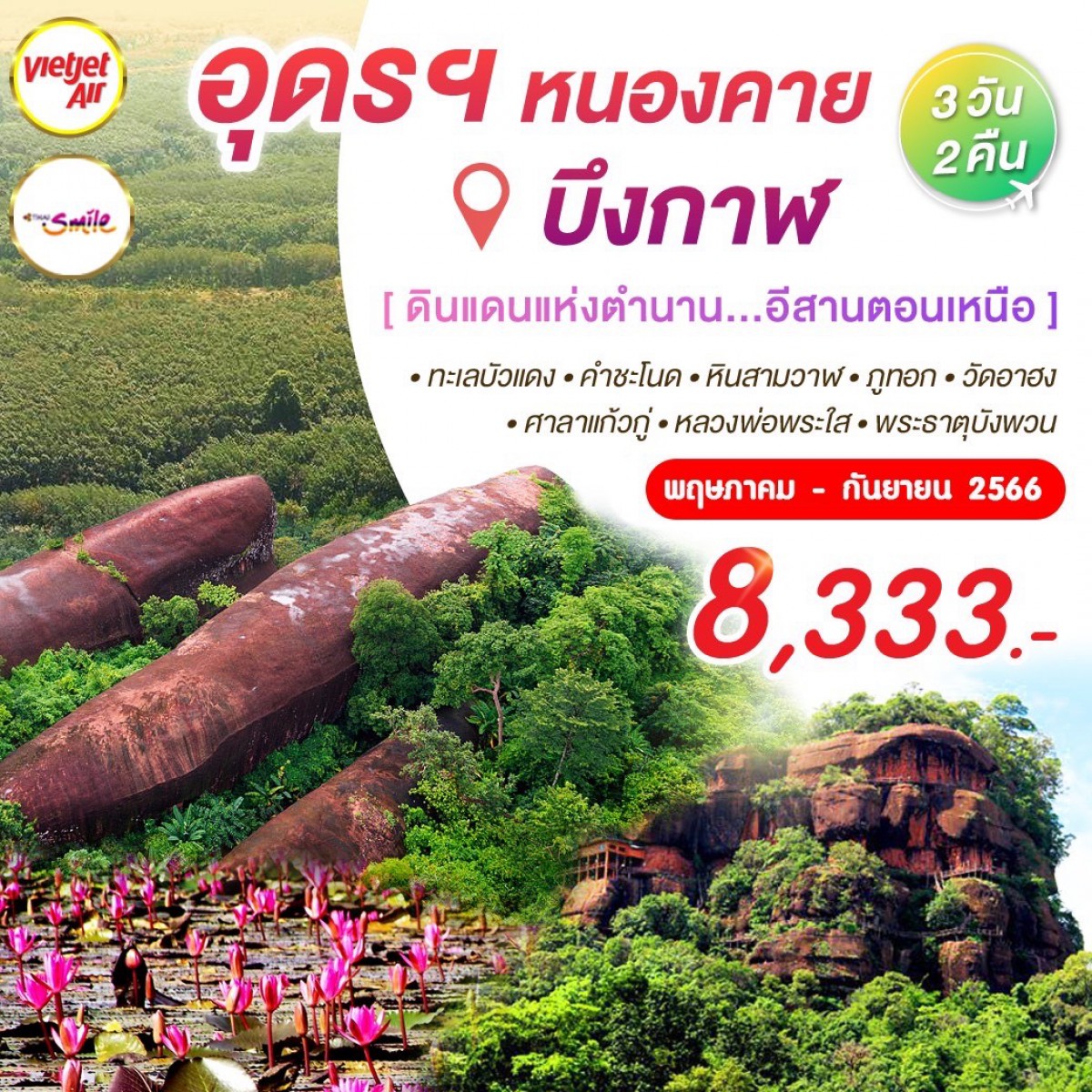 3 วัน 2 คืน ดินแดนแห่งตำนาน อีสานตอนเหนือ ทะเลบัวแดง คำชะโนด หินสามวาฬ ภูทอก วัดอาฮง... อ่านต่อ