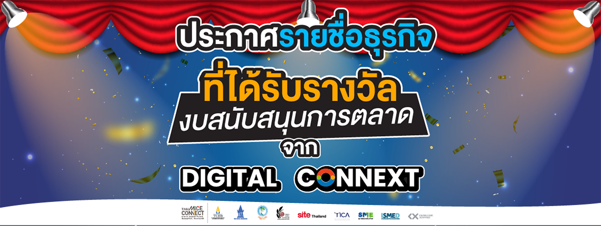 Thai MICE Connect ขอแสดงความยินดีกับ 20 รายชื่อธุรกิจ ที่ได้รับรางวัลงบสนับสนุนการตลาด จากโครงการ Digital Connext เพื่อให้ผู้ประกอบการนำงบสนับสนุนการตลาด สร้างโอกาสและต่อยอดความสำเร็จให้ธุรกิจ