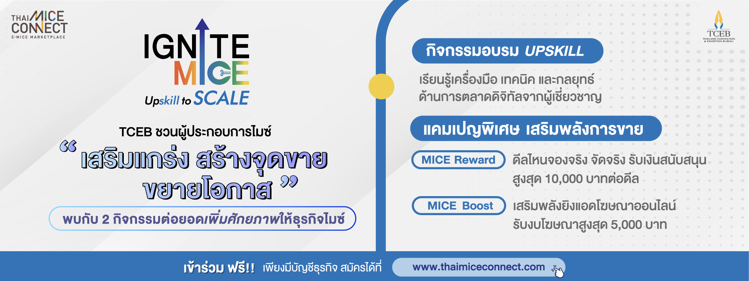 สำนักงานส่งเสริมการจัดประชุมและนิทรรศการ (องค์การมหาชน) หรือ TCEB เดินหน้าเสริมศักยภาพให้ผู้ประกอบการไมซ์ไทยทั่วประเทศ ด้วยการเปิดตัวโครงการ “IGNITE MICE Upskill to Scale” ภายใต้แนวคิด “จุดประกายธุรกิจไมซ์ เสริมแกร่ง สร้างจุดขาย ขยายโอกาส” ซึ่งมุ่งเน้นการส่งเสริมองค์ความรู้ด้านการตลาด การขาย และการใช้เครื่องมือดิจิทัล เพื่อเพิ่มขีดความสามารถในการแข่งขันของผู้ประกอบการในยุคที่ตลาดไมซ์เปลี่ยนแปลงอย่างรวดเร็ว
