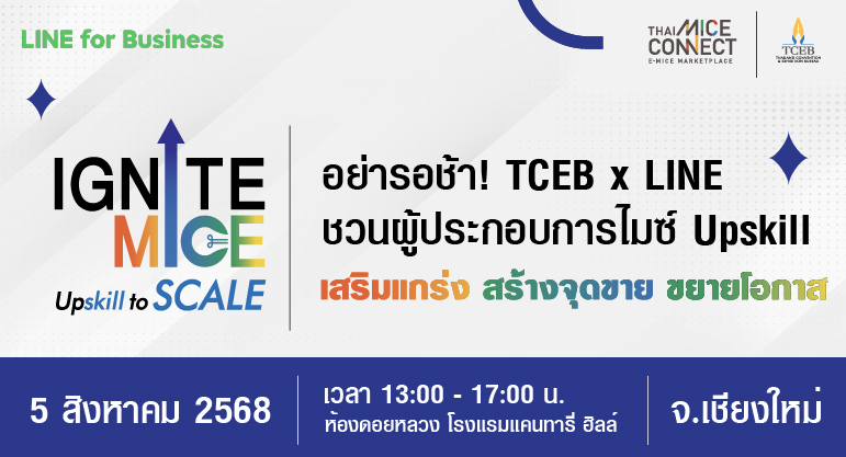 อบรมอัปสกิล เตรียมความพร้อมทั่วประเทศ เพื่อให้ผู้ประกอบการไมซ์ได้เรียนรู้เครื่องมือ เทคนิค และกลยุทธ์ที่สามารถนำไปใช้ได้จริง ที่จะจัดขึ้นในหลายจังหวัดทั่วประเทศ โดยกิจกรรมแรกจะเริ่มต้นที่ จังหวัดเชียงใหม่ ในวันที่ 5 สิงหาคม 2568 ณ โรงแรมแคนทารี่ ฮิลล์ จังหวัดเชียงใหม่ ภายใต้ความร่วมมือระหว่าง TCEB และ LINE ประเทศไทย ผู้เข้าร่วมจะได้เรียนรู้กลยุทธ์การตลาดออนไลน์แบบเจาะลึกจากผู้เชี่ยวชาญ ทั้งเทคนิคการสร้างโปรโมชั่นผ่าน e-Voucher การใช้ LINE Ads อย่างมีประสิทธิภาพ และการทำ Short Video เพื่อดึงดูดกลุ่มลูกค้าไมซ์