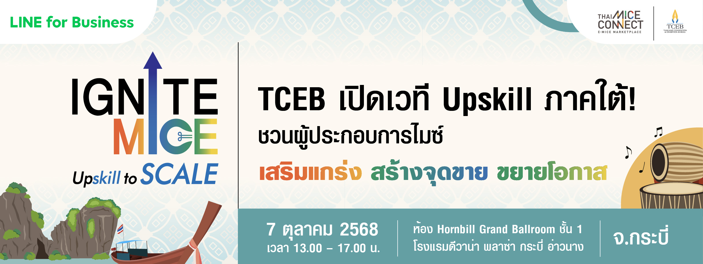 TCEB ร่วมกับ Line for Business เดินหน้าสนับสนุนผู้ประกอบการไมซ์ไทยให้พร้อมแข่งขันในยุคดิจิทัล จัดสัมมนาในโครงการ “IGNITE MICE Upskill to Scale : จุดประกายธุรกิจไมซ์ เสริมแกร่ง สร้างจุดขาย ขยายโอกาส” เพื่อยกระดับทักษะและศักยภาพทางการตลาดดิจิทัลให้กับผู้ประกอบการไมซ์ที่จังหวัดกระบี่