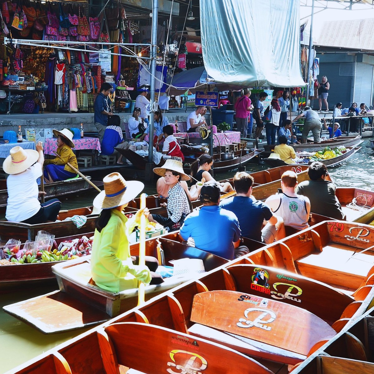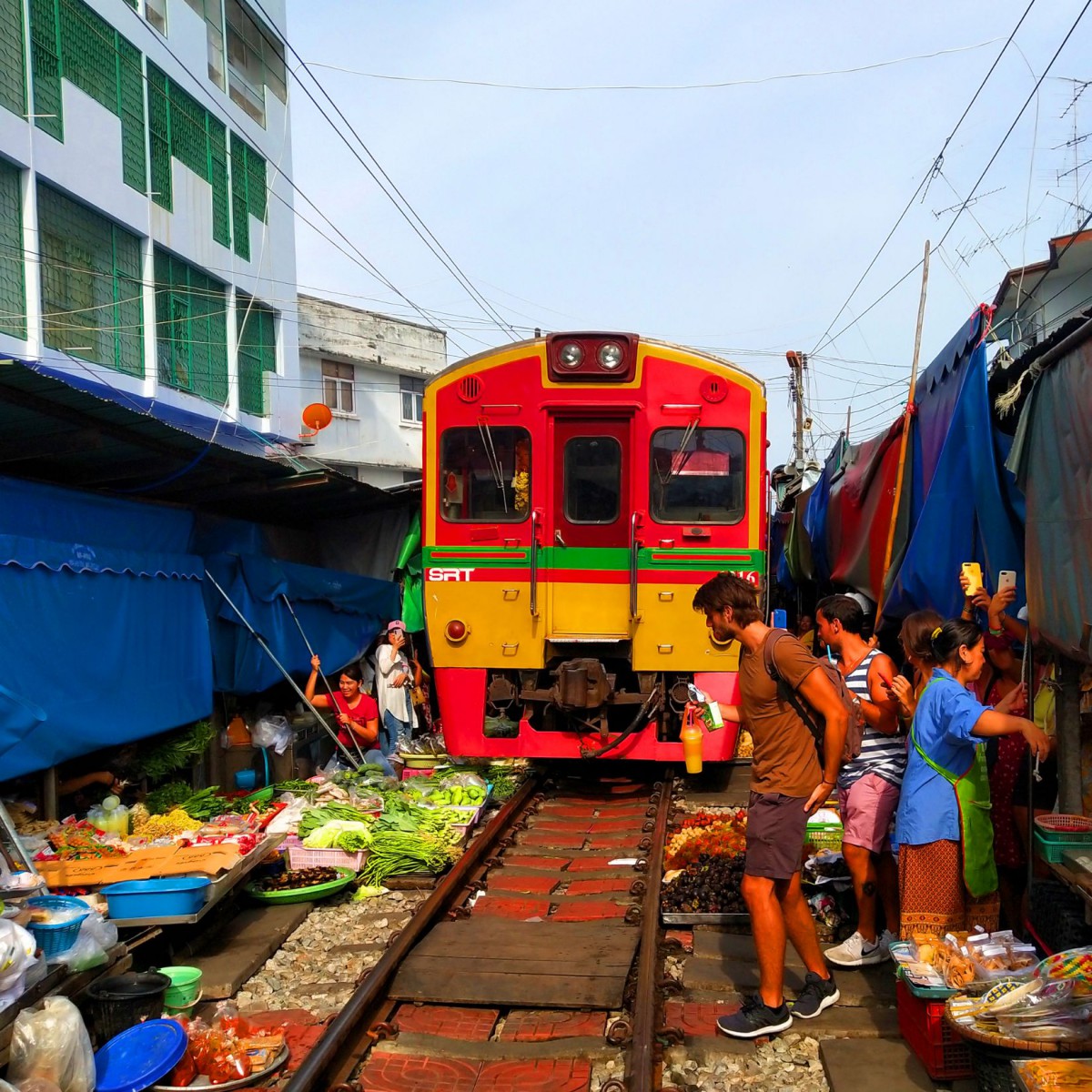 Sightseeing a market located on the railway tracks, the Maeklong Railway Market, and a market that floats on the canals at the Damnoen Saduak Market.