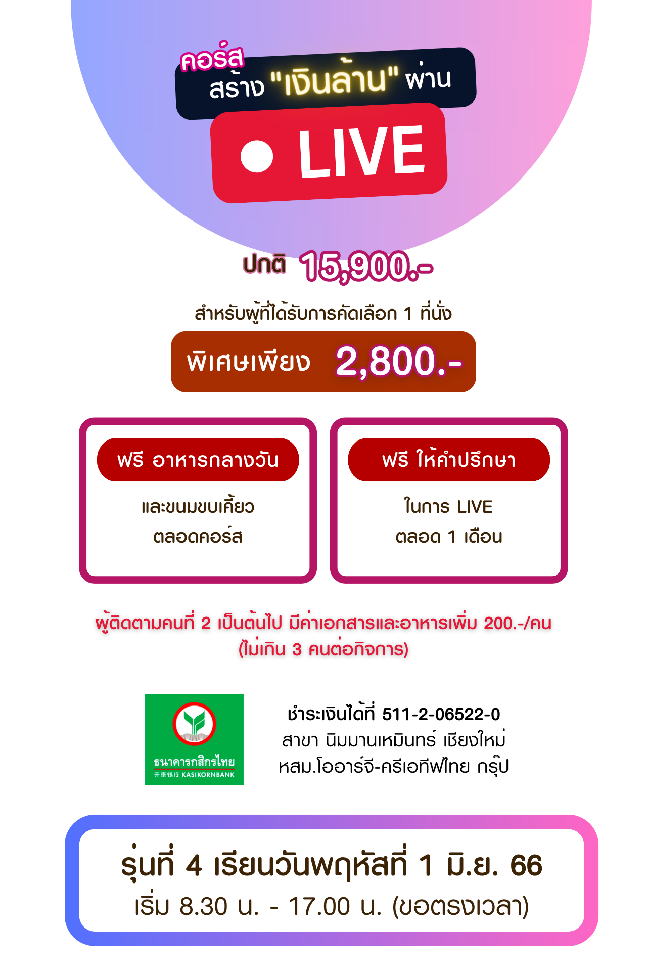 คอร์สสร้าง "เงินล้าน" ผ่าน LIVE สด ระยะเวลาเพียง 1 วันจะเปลี่ยนเป็นวันมหัศจรรย์ของตัวคุณ สิ่งที่คุณจะได้เรียน
