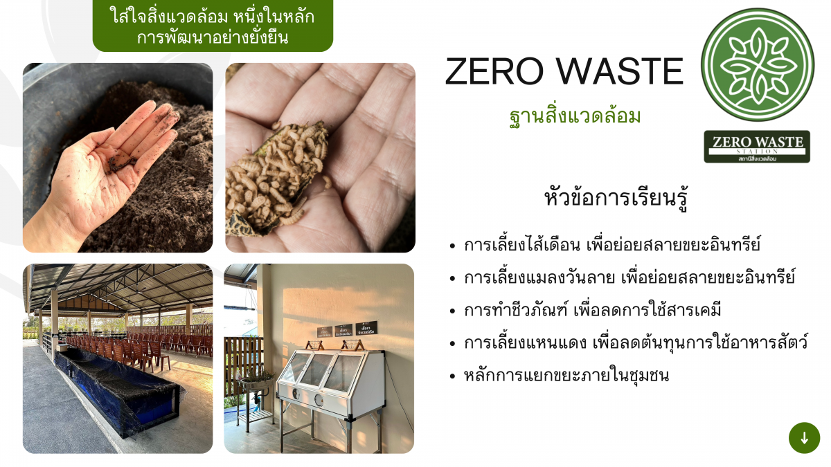 หัวข้อการเรียนรู้ การเลี้ยงไส้เดือน เพื่อย่อยสลายขยะอินทรีย์ การเลี้ยงแมลงวันลาย เพื่อย่อยสลายขยะอินทรีย์ การทำชีวภัณฑ์ เพื่อลดการใช้สารเคมี การเลี้ยงแหนแดง เพื่อลดต้นทุนการใช้อาหารสัตว์ หลักการแยกขยะภายในชุมชน