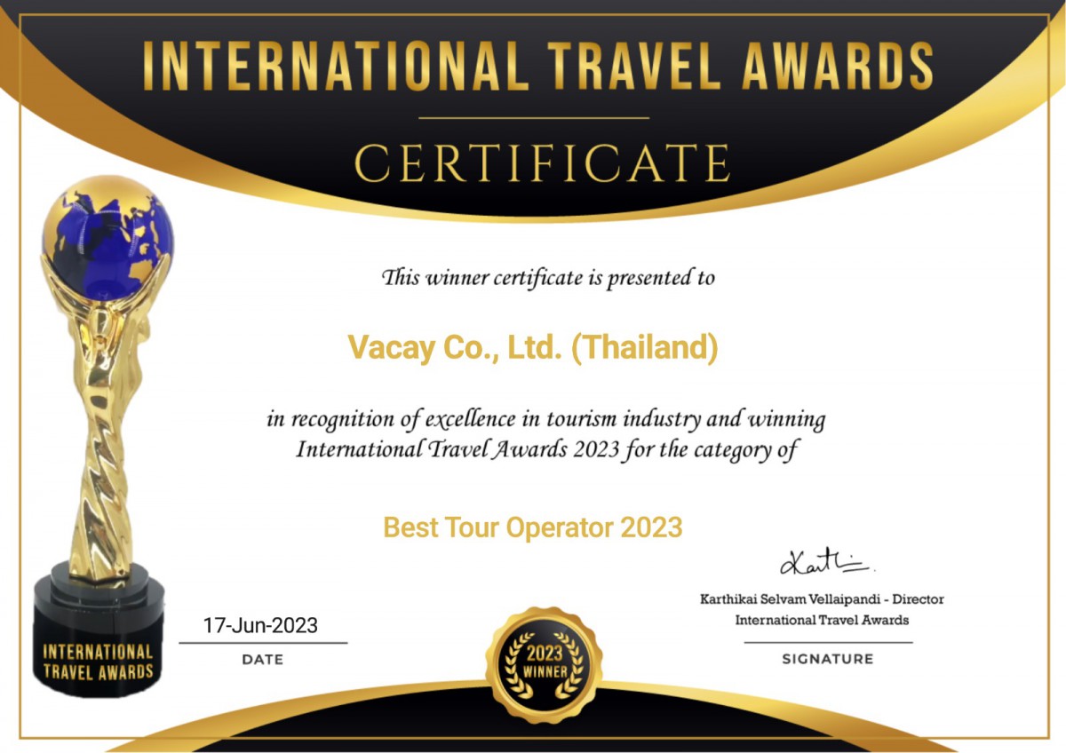 Certificate of Excellence: Vacay Co., Ltd. (Thailand) has been awarded a best tour operator 2023 by International Travel Awards, one of the worlds most popular travel awards websites.