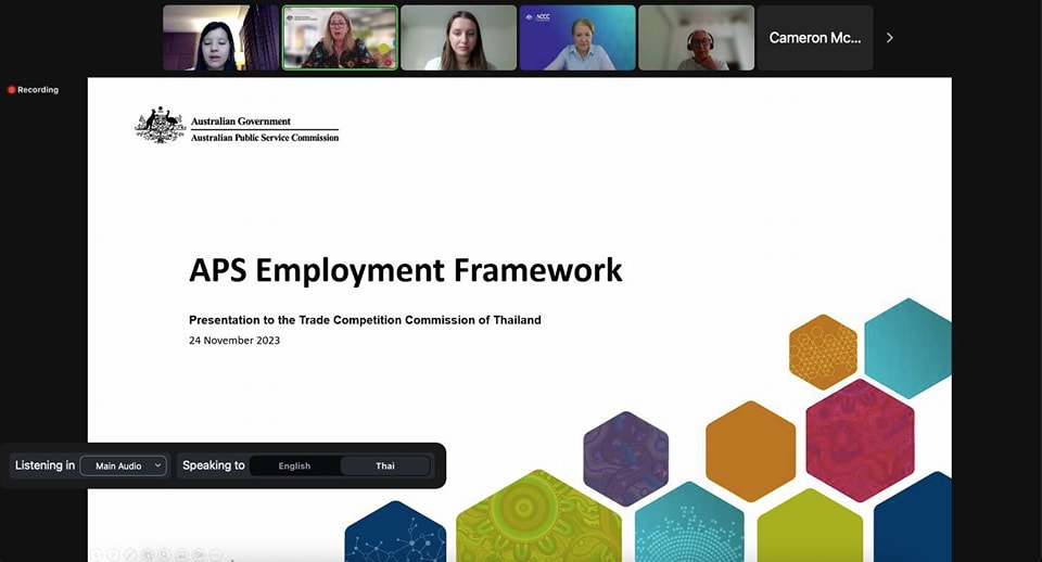 Onni Translation delivered impeccable Remote Thai-English simultaneous interpretation services for the Trade Competition Commission of Thailand, focusing on the APS Employment Framework. Our commitment to providing seamless communication in virtual settings ensures that crucial discussions on trade and competition are accessible and effective.