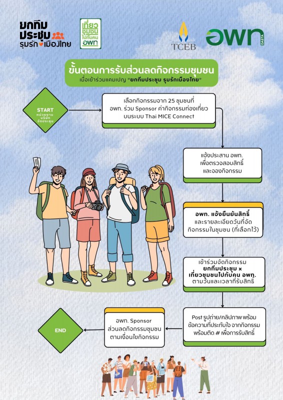1. เพียงเข้าร่วมแคมเปญ "ยกทีมประชุม รุมรักเมืองไทย" พร้อมแจ้งความประสงค์ การจัดกิจกรรมในชุมชนที่ อพท. คัดสรร
