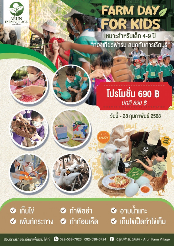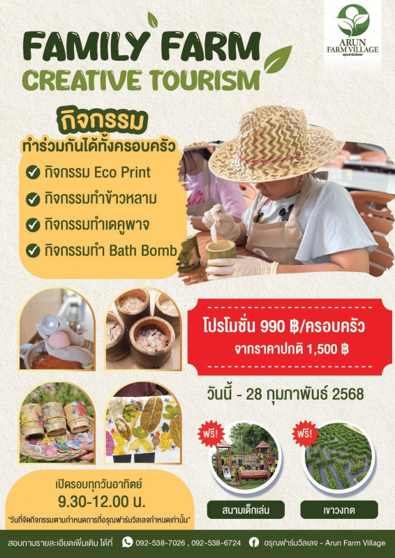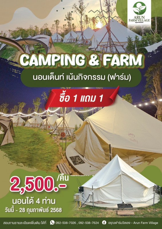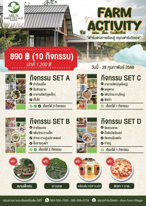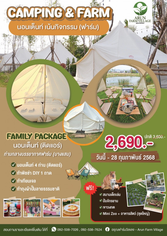 อรุณฟาร์มวิลเลจ มอบความพิเศษสำหรับผู้ที่มาร่วมงาน กับแพ็คเกจสุดคุ้ม เเละส่วนลดถึง 40% เอาใจสายท่องเที่ยวตั้งเเคมป์ สายกิจกรรม Workshop สุด ๆ คุ้มขนาดนี้ จะพลาดได้ไง!! อรุณฟาร์มวิลเลจ พร้อมมอบประสบการณ์ใหม่ ๆ ใหักับ น้อง ๆ หนู ๆ ว่างเเล้วรีบมาจองราคาสุดพิเศษกัน พร้อมกิจกรรมครอบครัวอีกมากมายที่รอคุณอยู่