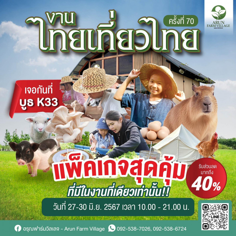 งานไทยเที่ยวไทย ครั้งที่ 70 นี้ พบกับ อรุณฟาร์มวิลเลจ ในวันที่ 27 -30 มิ.ย. 67 กัน ที่ ไบเทคบางนา บูธ K33 จัดเต็มทั้งการท่องเที่ยวเชิงเกษตร กิจกรรมเชิงสร้างสรรค์ กิจกรรมสำหรับเด็ก ฟาร์มทัวร์ เเละกิจกรรมการท่องเที่ยวที่ อรุณฟาร์มวิลเลจ อีกมากมาย มาร่วมพบกันในงาน