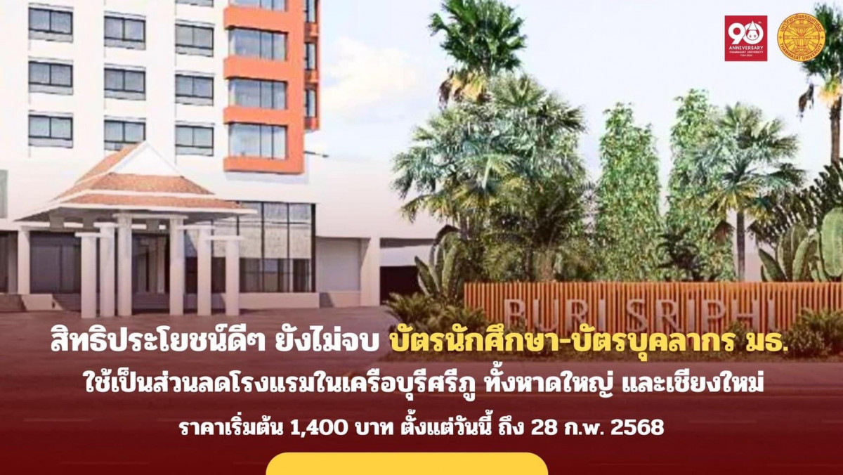 ล่าสุดโรงเเรมในเครือบุรีศรีภู ทั้งหาดใหญ่ และเชียงใหม่ มอบสิทธิประโยชน์พิเศษ ส่วนลดค่าที่พักพร้อมอาหารเช้า สำหรับนักศึกษา และบุคลากร มหาวิทยาลัยธรรมศาสตร์ เพียงแค่พกบัตรก็ใช้สิทธิได้ทันที!!!
