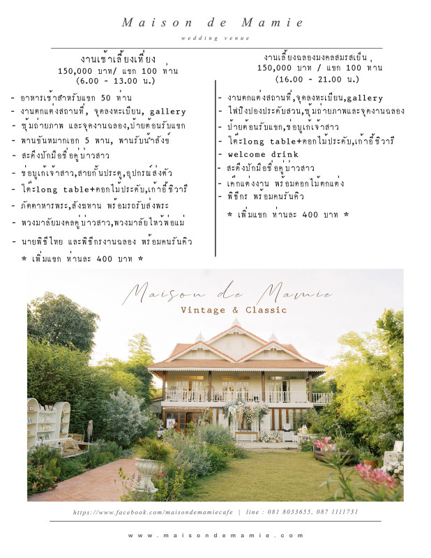 เมซองเดอมามี สถานที่จัดงานแต่งงานบรรยากาศอบอุ่น ในสไตล์วินเทจและคลาสสิค เราเป็น wedding organizer ซึ่งรวมสถานที่จัดงาน และการตกแต่ง พร้อมด้วยนายพิธี และอาหารเช้าไว้บริการ หรือถ้ามีสถานที่อยู่แล้ว จะให้เราไปจัดตกแต่งให้ ก็สามารถทำได้ อุปกรณ์ที่ใช้ในงานพิธี และพร็อพต่างๆ เป็นของแอนทีคสะสมที่ทรงคุณค่า photo backdrop เรามีให้เลือกหลายแบบ รวมทั้งธีมสีดอกไม้ ที่เข้ากันตั้งแต่ซุ้มถ่ายภาพ จุดลงทะเบียน ป้ายต้อนรับแขก มุมประกอบพิธี ไปจนถึงการจัดโต๊ะอาหารแบบ long table ให้มีความทันสมัย มีมุมถ่ายภาพมากมาย ทั้งในสวนที่เต็มไปด้วยดอกไม้สีหวานๆ และในบ้านที่เน้นแสงธรรมชาติลอดผ่านประตูหน้าต่าง ทำให้ภาพมีความนุ่มนวลโรแมนติค และเรามีรายละเอียดในงานที่ไม่เหมือนใคร คือ สะดึงปักมือ ที่เราปักลงบนผืนผ้าลินิน มอบให้คู่รักเก็บไว้เป็นของที่ระลึกวันแต่งงาน และเมื่อจัดงานเสร็จแล้ว ดอกไม้ที่ใช้ตกแต่งในงาน เราได้นำมาอบแห้ง นำมาประดิษฐ์เป็นการ์ดขอบคุณให้กับคู่รัก เป็นงานฝีมือจากใจของเราจริงๆ