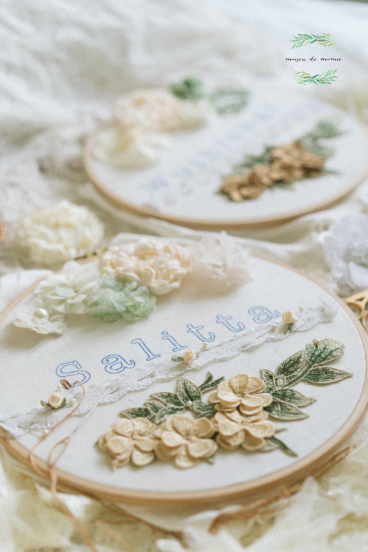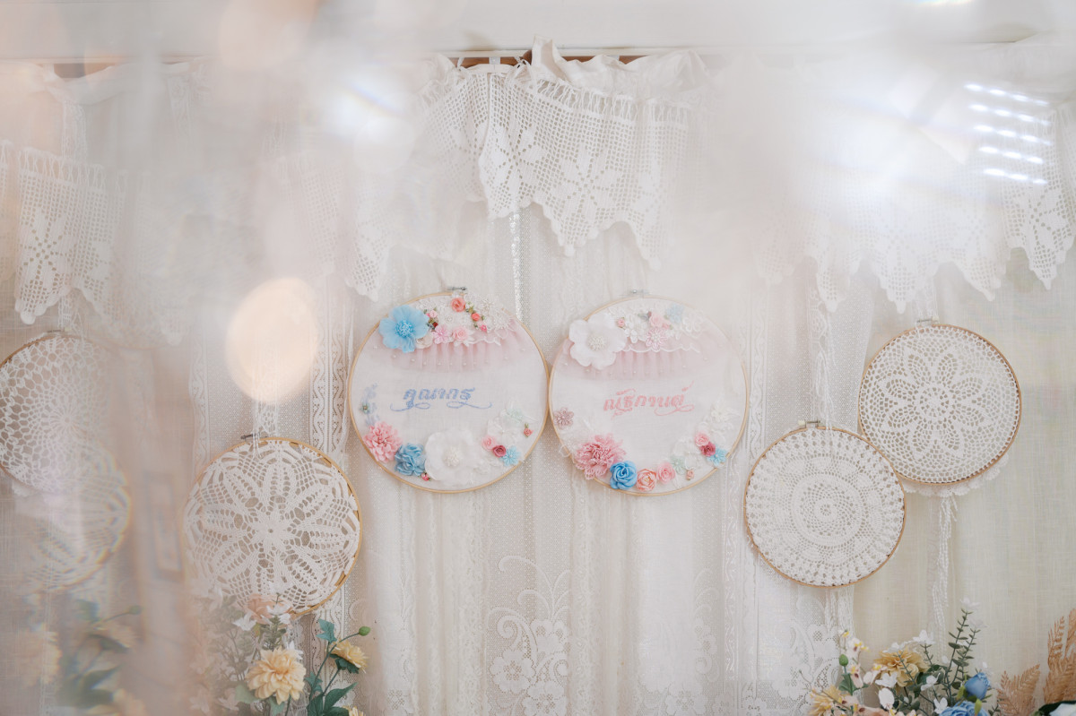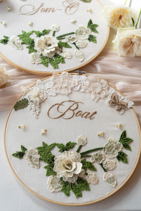 ในงานแต่งงาน ส่วนใหญ่แล้วเรามักจะเห็นป้ายชื่อคู่บ่าวสาว ทำจากโฟม หรืออะครีลิค เมื่อใช้งานเสร็จแล้ว ก็จะต้องทิ้งไป กลายเป็นขยะ ที่กลายเป็นปัญหาสิ่งแวดล้อม เราจึงมีแนวคิดในการทำป้ายชื่อคู่บ่าวสาว ในแนวอนุรักษ์ธรรมชาติ ด้วยการปักสะดึงชื่อคู่บ่าวสาว บนผ้าลินิน แทนการใช้อักษรโฟม ออกแบบไม่ซ้ำกันในแต่ละคู่ ไม่ว่าจะเป็นตัวอักษร ลูกไม้ ดอกไม้ผ้า ตกแต่งให้ตามธีมสีงาน เมื่อเสร็จงานแล้ว เราจะมอบให้เป็นของที่ระลึกจากงานแต่งงาน เป็นของขวัญที่มีคุณค่าทางจิตใจทั้งผู้ให้และผู้รับ
