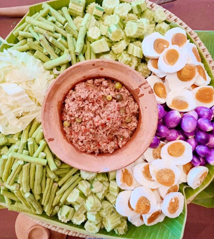 ปลากะพงทอดกระเทียม ลาบไก่สับ+ผัก น้ำพริกลงเรือไก่สับไข่เค็ม+ผัก ข้าวหอมมะลิ