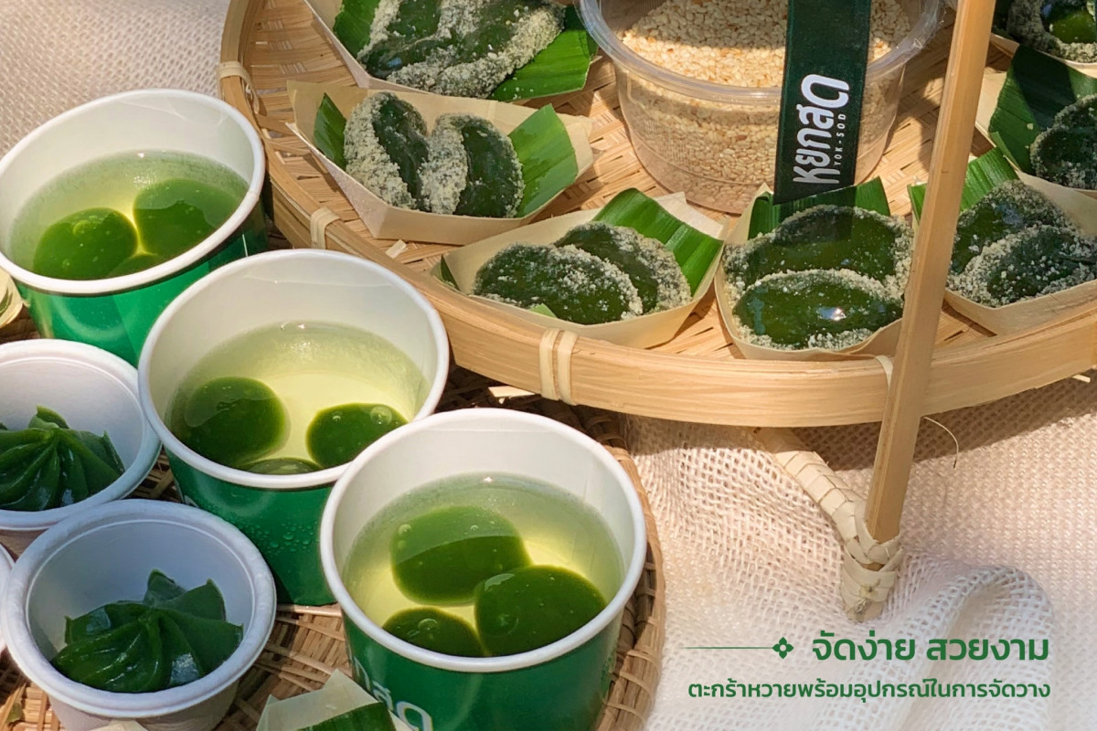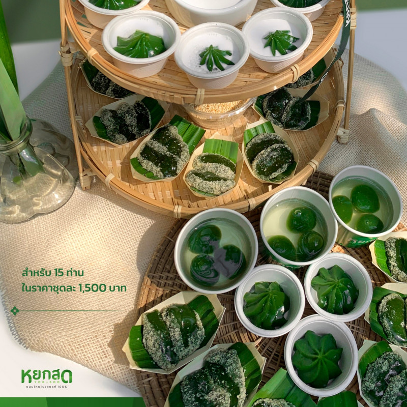 ด้วยเสน่ห์ของขนมไทยที่หยกสดนำมาปรับให้รสชาติหวานน้อย หลากหลายเมนูขนมไทยหายาก กลิ่นหอมใบเตยแท้ๆ มาพร้อมกระเช้าจัดวางพร้อมยกไปเซอร์ไพรส์แบบไม่ซ้ำใคร อีกทั้งเรายังจัดส่งพร้อมต้นเตยที่สามารถนำมาตกแต่งให้การเซอร์ไพรส์ของคุณพิเศษขึ้นมา