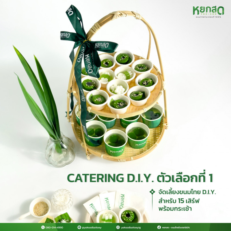 สำหรับใครที่กำลังมองหาทางเลือกใหม่ในการเซอร์ไพร์วันเกิด เซ็ตขนมไทย Catering D.I.Y อาจเป็นคำตอบที่ลงตัว ทั้งความอร่อย ความหมายที่ดี มงคล ความสวยงาม และกลิ่นใบเตยที่หอมประทับใจ ซึ่งเซ็ต Catering D.I.Y 15 เสิร์ฟ 1 เซ็ตสามารถเลือกได้ถึง 3 เมนู จะได้ขนมอย่างละ 15 ชิ้น 1 กระเช้าจะได้ขนมถึง 45 ชิ้นทีเดียว