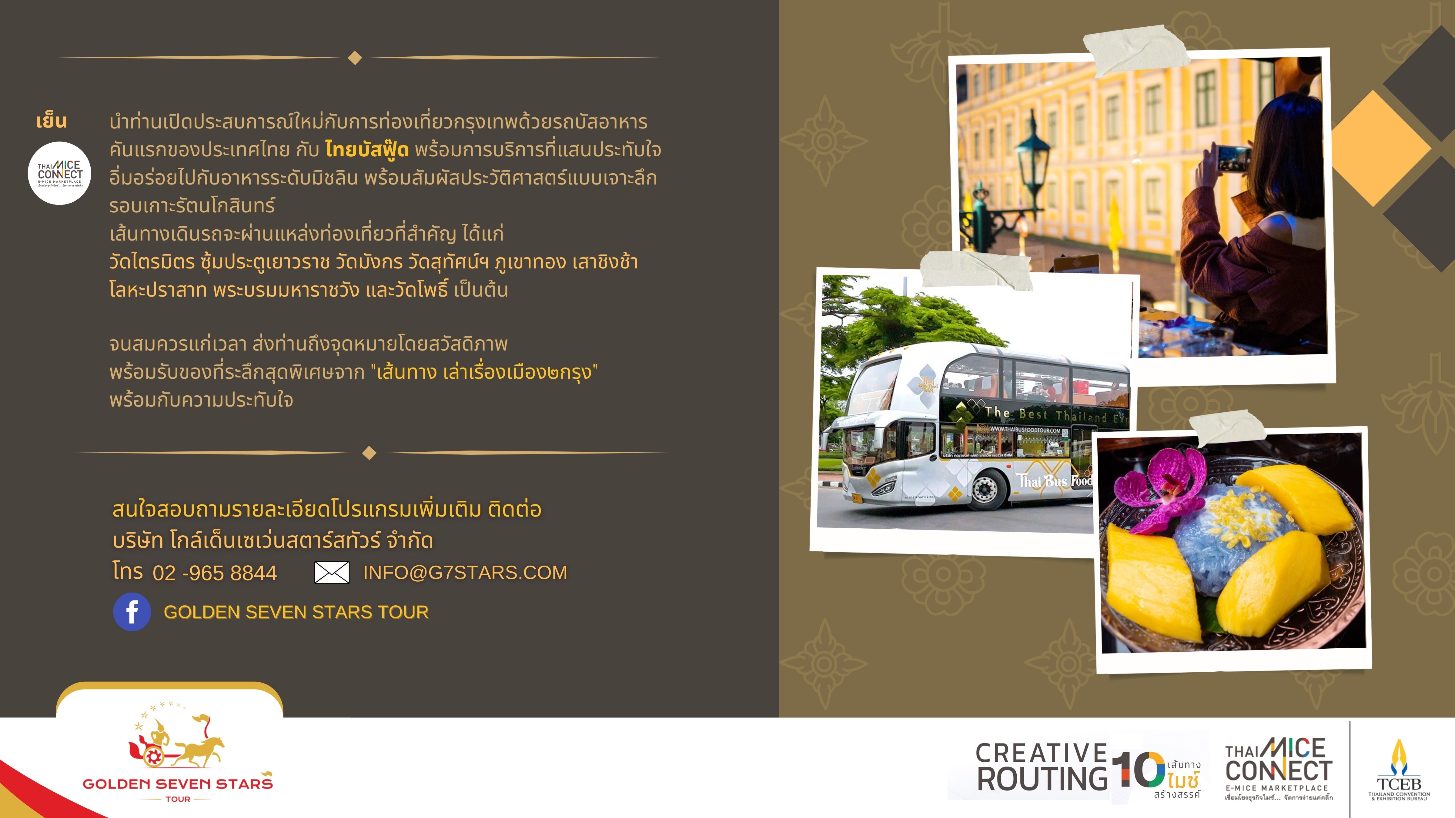 ล่องเรือโบราณ เรือทรงกาบมะพร้าว - ทานอาหารแบบต้นตำรับสำรับชาววังที่หาทานได้ยาก - เรียนรู้ภูมิปัญญาชุมชน ด้วยการทำ ลูกประคบสมุนไพร - สนุกสนานกับกิจกรรม สามล้อหัวกบตะลุยเมืองเก่า - บำรุงร่างกายด้วยเมนู เมี่ยงคำบัวหลวงแบบโบราณ - เปิดประสบการณ์ใหม่กับการท่องเที่ยวเกาะรัตนโกสินทร์โดยรถบัสอาหารคันแรกของประเทศไทย -อิ่มอร่อยไปกับอาหารระดับมิชลิน - พร้อมขอพรสิ่งศักดิ์สิทธิ์ เรื่องโชคลาภ และการค้าขาย