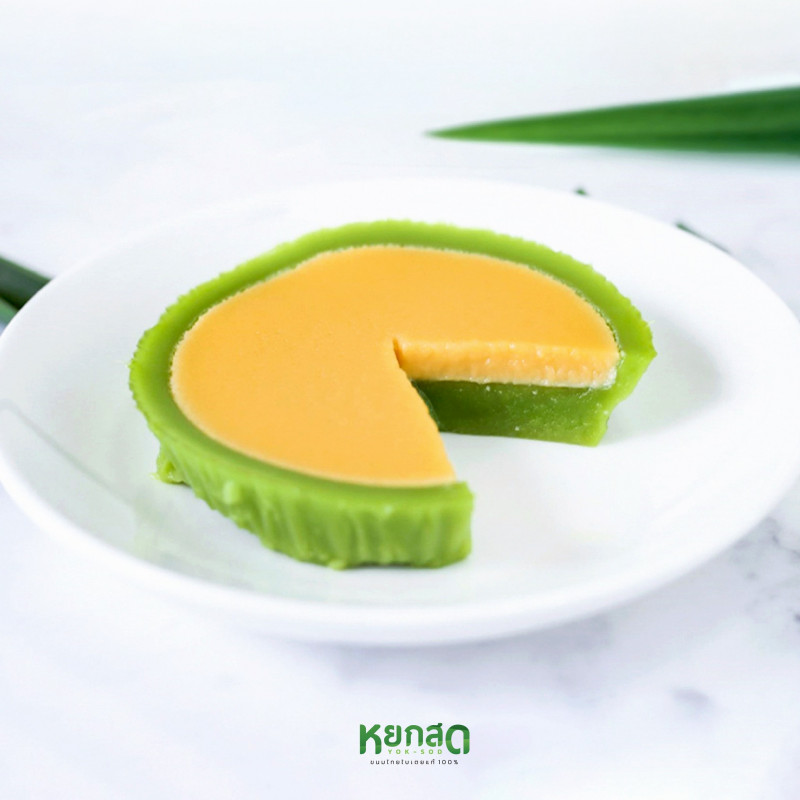 บุหลันมรกต สังขยาตรงกลางล้อมรอบด้วยแป้งใบเตยหอมนุ่ม สวยงามเหมือนพระจันทร์