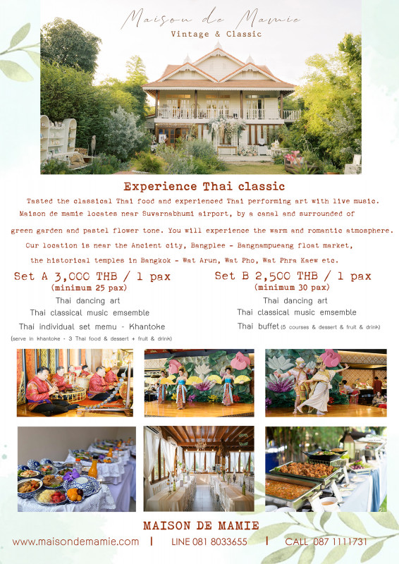 เมซองเดอมามี บ้านไทยสไตล์คลาสสิค วินเทจ บริการจัดเลี้ยง ในโอกาสต่างๆ หรือต้อนรับกรุ๊ปทัวร์ ที่รักความเป็นไทย ดื่มด่ำกับวัฒนธรรม ชมรำไทย และฟังดนตรีบรรเลงขับกล่อมในช่วงมื้ออาหาร จากกรมศิลปากร