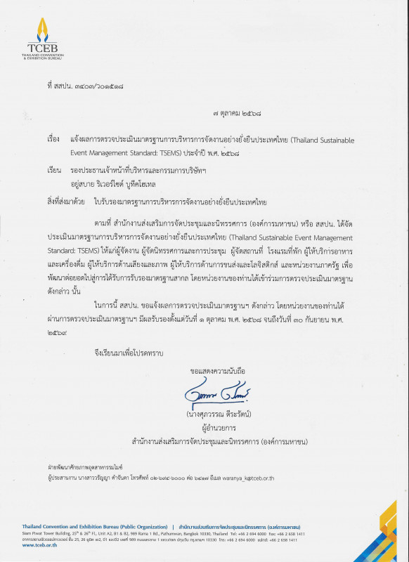 ได้ผ่านการรับรองมาตรฐานการบริหารการจัดงานประชุมอย่างยั่งยืน หรือ Thailand Sustainable Event Management Standard ระดับ 1 TSEMS Committed