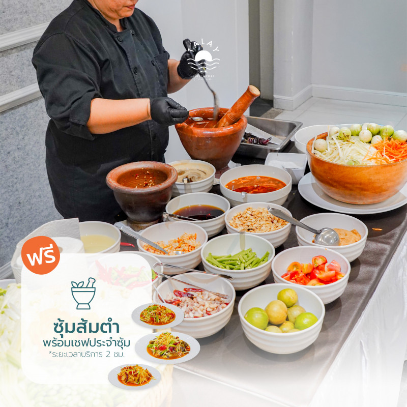 - ฟรี ซุ้มส้มตำ พร้อมเชฟประจำซุ้มระยะเวลาบริการ 2 ชม. (เมนูส้มตำไทย ปู หอยดอง)