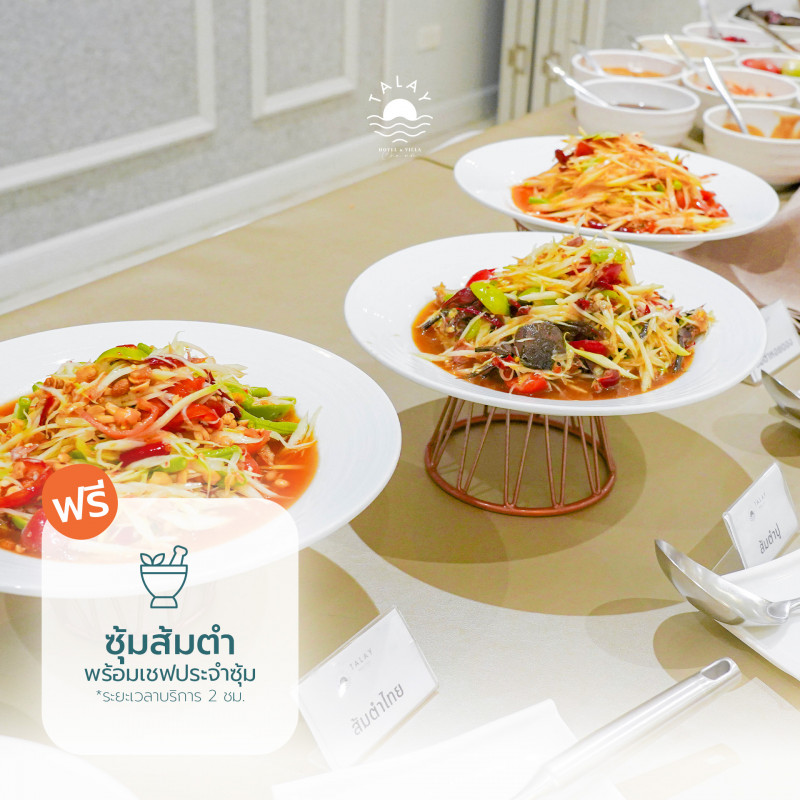 - ฟรี ซุ้มส้มตำ พร้อมเชฟประจำซุ้ม ระยะเวลาบริการ 2 ชม. (ส้มตำไทย / ปู / หอยดอง)