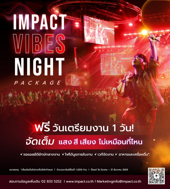 เปิดให้จองตั้งแต่วันที่ 16 มีนาคม – 31 ธันวาคม 2569 IMPACT Vibes Night Package ไม่ได้เป็นเพียงแค่งานเลี้ยง แต่คือประสบการณ์ที่ช่วยเปลี่ยนทุกช่วงเวลาของคุณให้กลายเป็นความทรงจำที่น่าประทับใจ และแตกต่างอย่างแท้จริง ✨