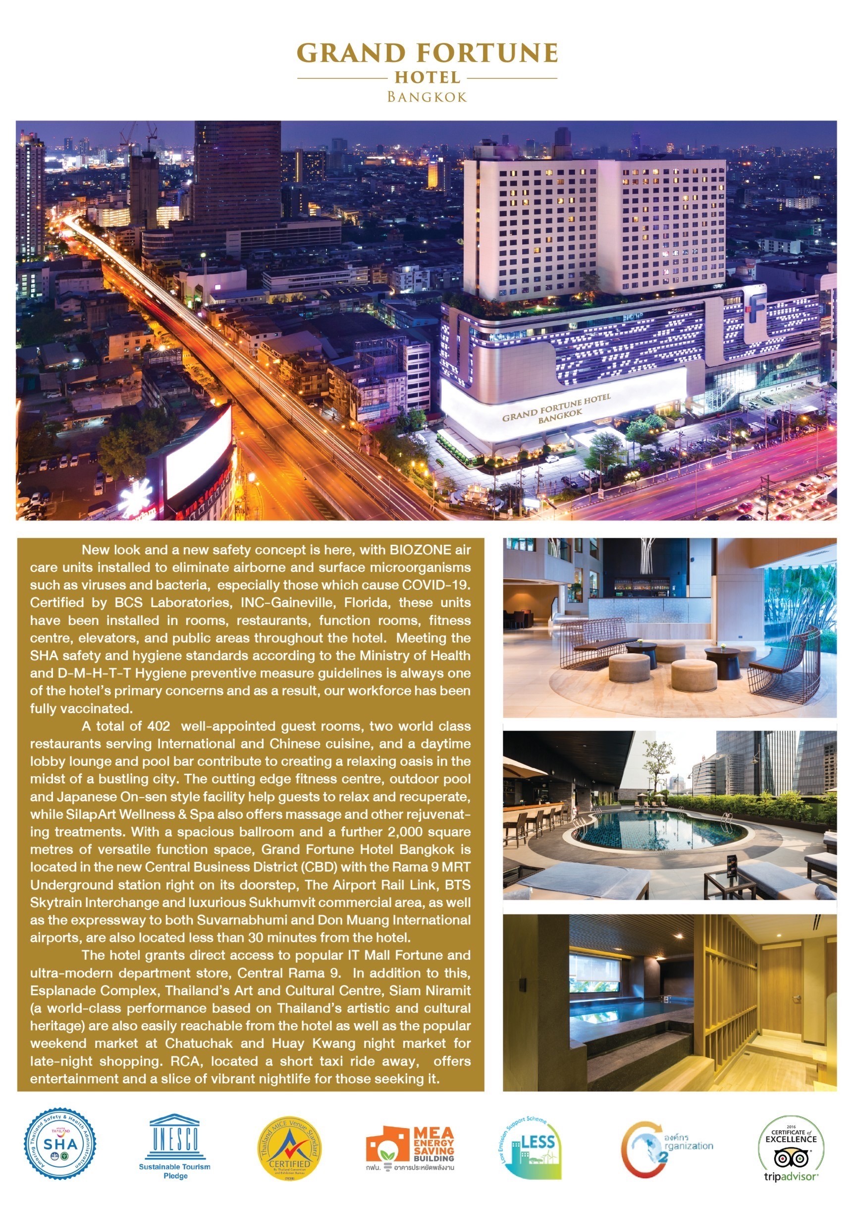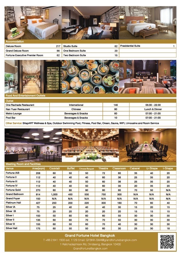 โรงแรมแกรนด์ ฟอร์จูน กรุงเทพฯ มีบริการห้องพัก ห้องประชุมและจัดเลี้ยง ที่ต้องการเปลี่ยนบรรยากาศในการทำงานหรือประชุม ทั้งที่บ้านและออฟฟิศ มาที่โรงแรมของเราแทน ในราคาเป็นกันเอง