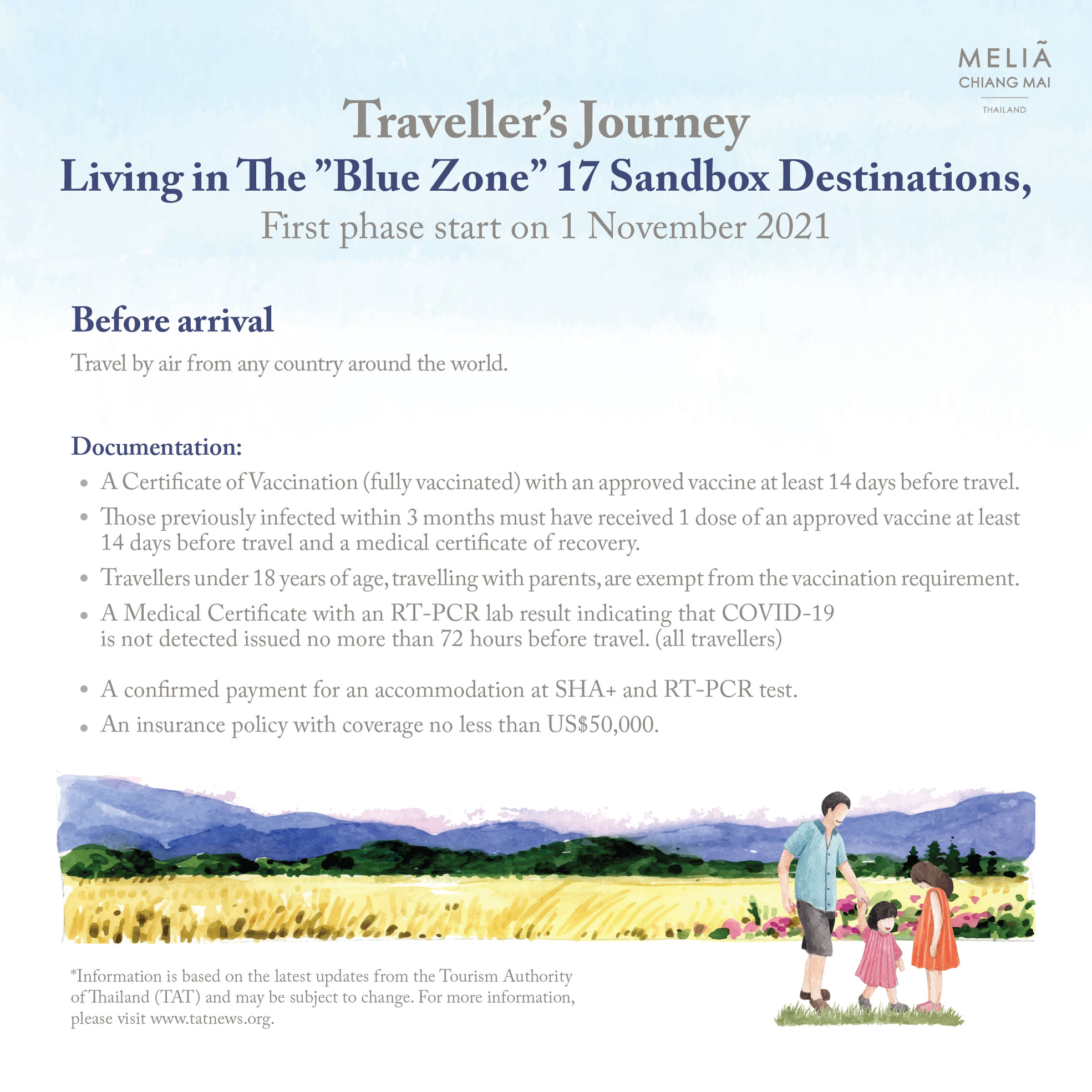 Thailand is all set to welcome fully vaccinated foreign visitors from the approved countries to live in 17 Blue Zone sandbox destination when enter the Kingdom by air from 1 November 2021. Visitors are required to stay at least 7 nights in a SHA+ hotel.