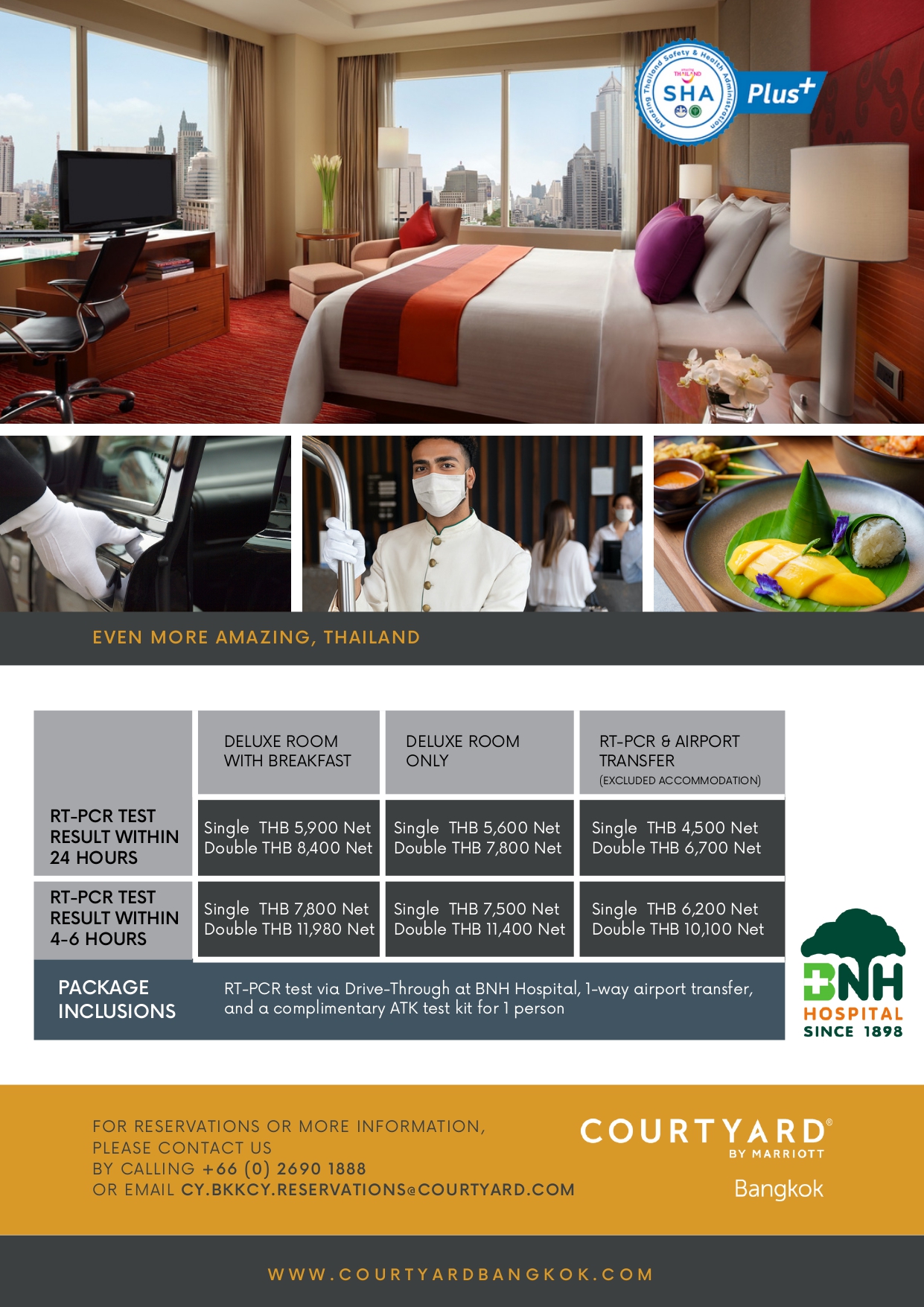 Deluxe Room, starting from THB 5,600 net! The package is inclusive of a drive-through RT-PCR test at BNH Hospital (result within 24 hrs), 1-way airport transfer, and a complimentary ATK test kit for 1 person. Explore Thailand EVEN FASTER with a rapid test result within 6 hrs by BNH Hospital, starting from THB 7,500 net in Deluxe Room, 1-way airport transfer, and a complimentary ATK test kit for 1 person. For more information and reservation please email us at [email protected]