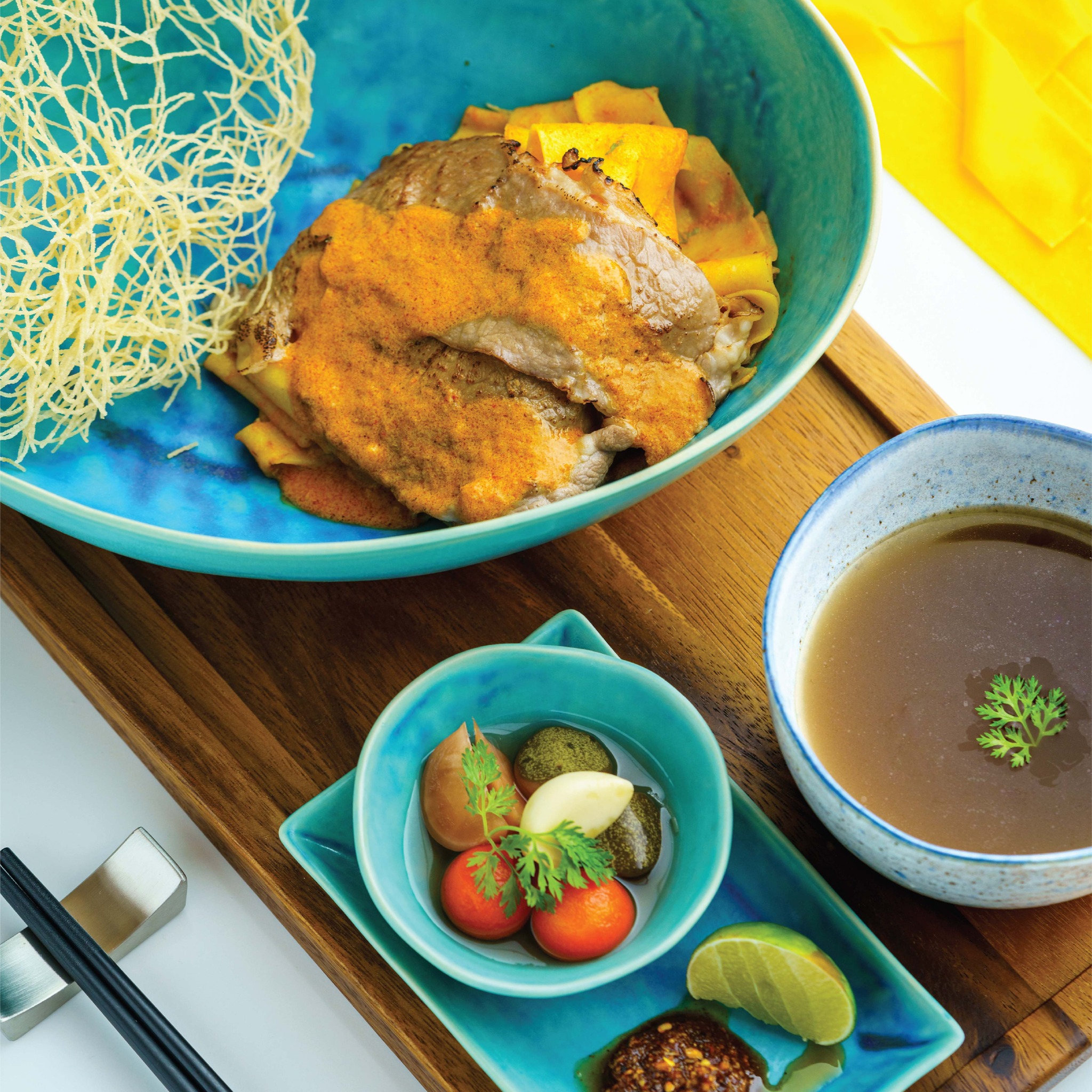 อีกเมนูที่ต้องลองและถือเป็นเมนูสร้างสรรค์จากอาหารที่ทุกคนโปรดปรานเมื่อมาถึงเชียงใหม่ ข้าวซอยเส้นพัพพาร์เดลล์เล่กับเนื้อสันนอกลนไฟ เสิร์ฟกับผักดองเครื่องเคียง