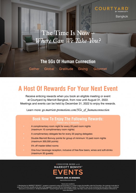 หากท่านกำลังมองหาที่จัดการประชุม ฝึกอบรมหรือสถานที่จัดงานเลี้ยงบริษัท ให้เราช่วยวางแผนการประชุมของท่านให้เป็นที่น่าจดจำมากยิ่งขึ้นด้วยสิทธิพิเศษเหนือระดับ เมื่อจองห้องประชุมหรืองานอีเวนต์ ณ โรงแรมคอร์ทยาร์ด โดย แมริออท กรุงเทพฯ