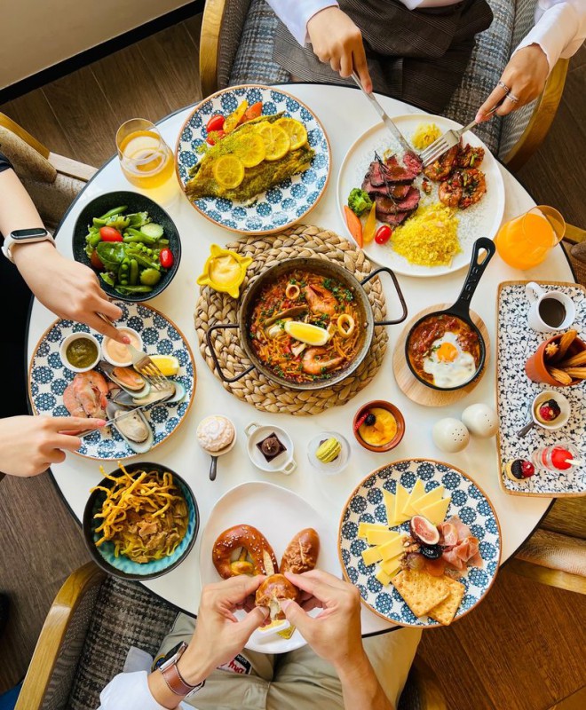 Among the brunchs highlights are tortilla espa~nola, chorizo and bacon quiche, imported Manchego and artisan cheeses, and a butchers corner serving a selection of cold cuts including Iberico ham (jamon), Spanish sausage (chorizo), chicken ham, and smoked fish.