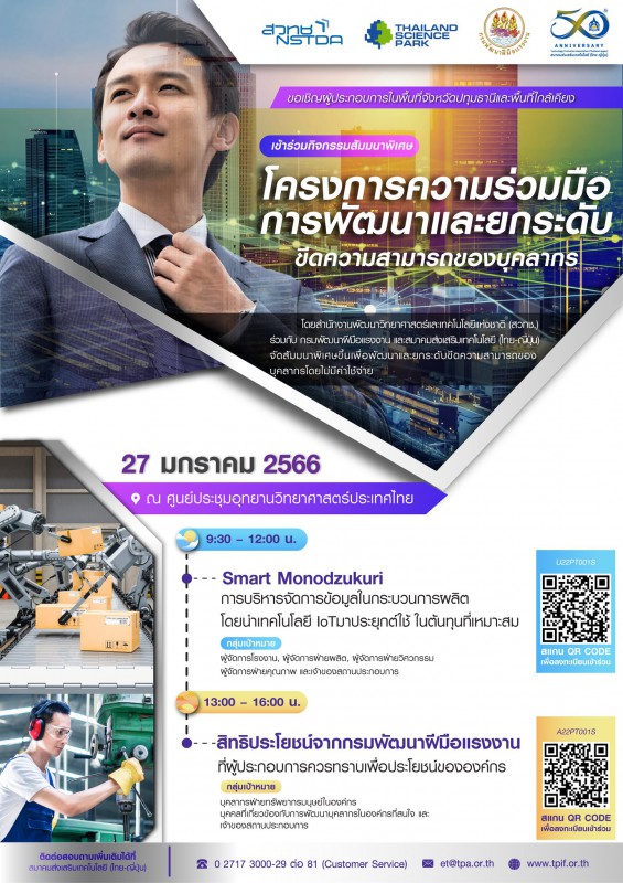 โดยสำนักงานพัฒนาวิทยาศาสตร์และเทคโนโลยีแห่งชาติ (สวทช.) ร่วมกับ กรมพัฒนาฝีมือแรงงาน และสมาคมส่งเสริมเทคโนโลยี (ไทย-ญี่ปุ่น) จัดสัมมนาพิเศษ เพื่อพัฒนาและยกระดับขีดความสามารถของบุคลากร #โดยไม่มีค่าใช้จ่าย