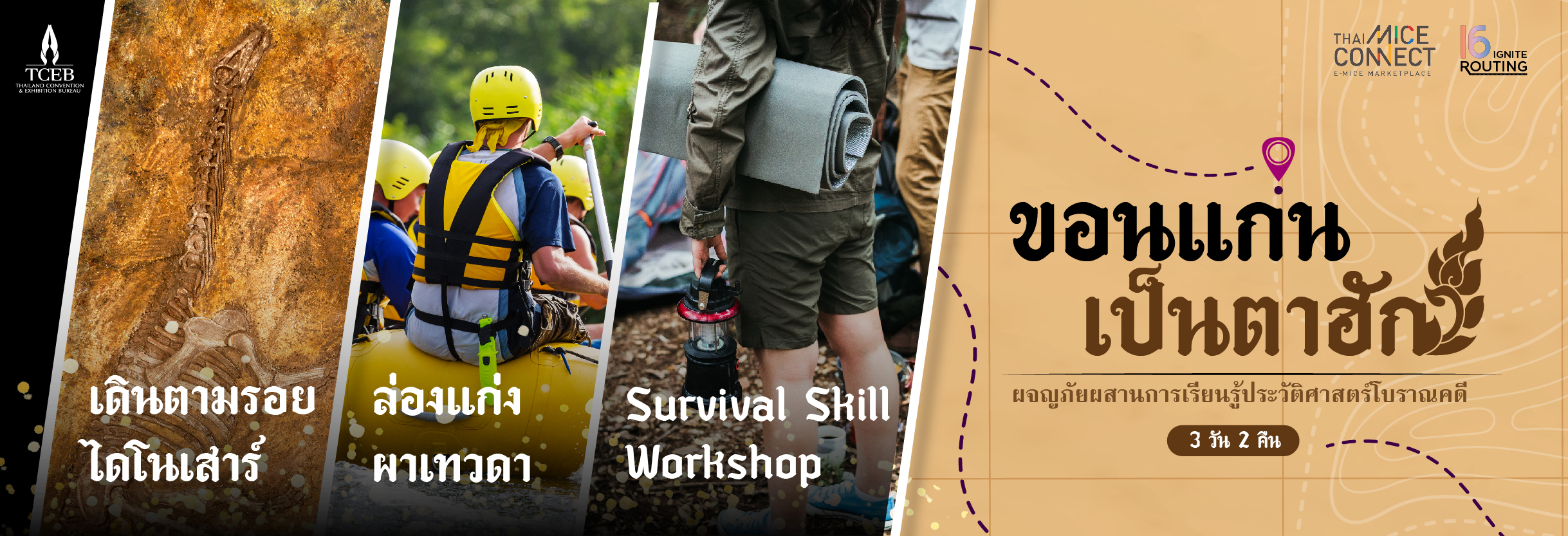 เริ่มต้นด้วยการต้อนรับที่อบอุ่นจากน้ำสมุนไพรท้องถิ่น ก่อนเข้าสู่เวิร์กช็อปทักษะการเอาตัวรอดในป่า เรียนรู้วิธีสร้างที่พักจากวัสดุธรรมชาติ การจุดไฟแบบดั้งเดิม และกรองน้ำจากธรรมชาติ พร้อมออกเดินป่าตามเส้นทางไดโนเสาร์ ณ อุทยานแห่งชาติภูเวียง เพลิดเพลินกับจุดชมฟอสซิลไดโนเสาร์ที่เลื่องชื่อ พร้อมฟังเรื่องราวทางประวัติศาสตร์มนต์ขลังของยุคดึกดำบรรพ์และการอนุรักษ์แหล่งโบราณคดี