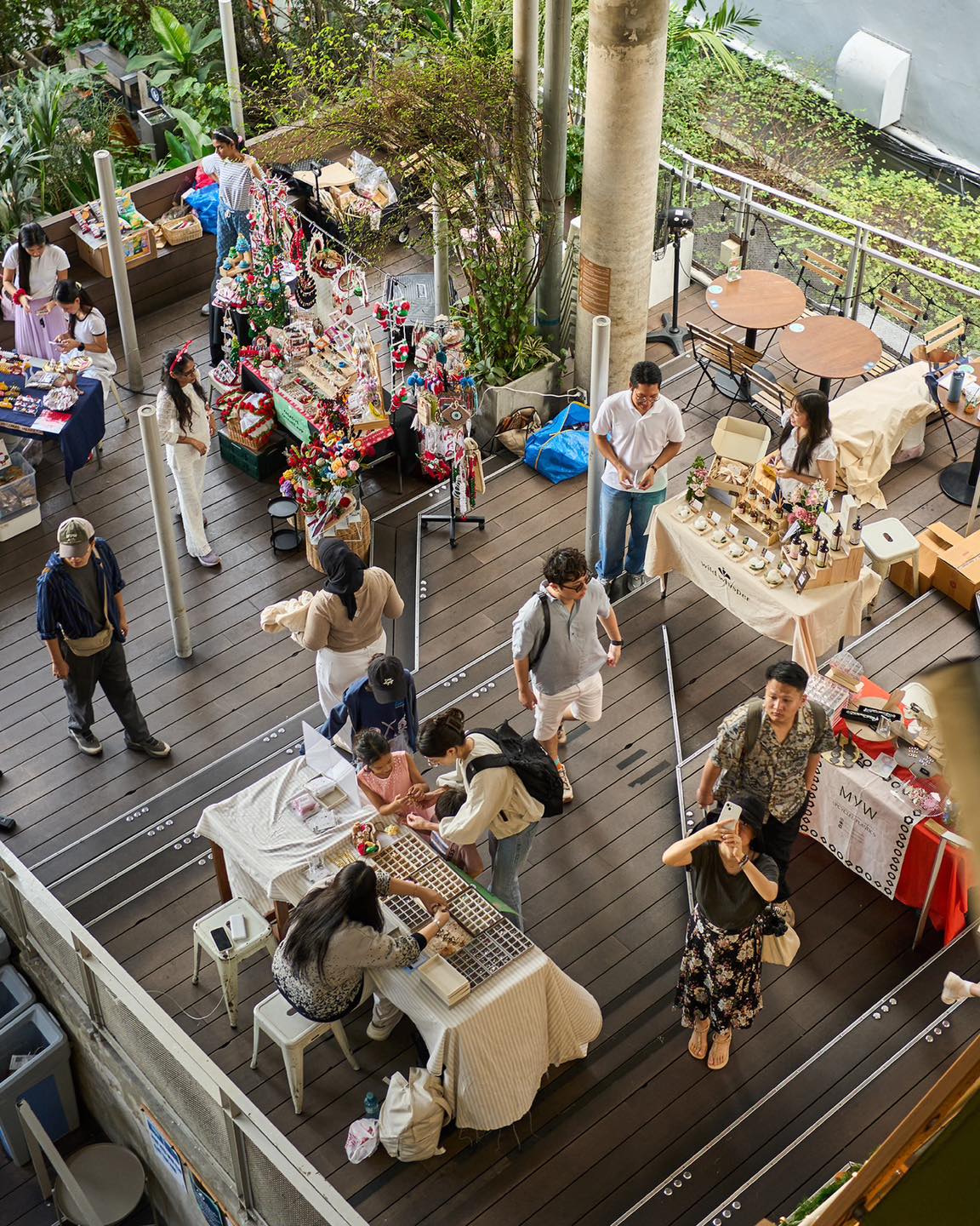 ที่นี่ไม่ได้มีแค่ที่นั่งชิล แต่ยังเต็มไปด้วยกิจกรรมที่เปลี่ยนไปในแต่ละช่วงเวลา ไม่ว่าจะเป็นเวิร์กช็อปเล็ก ๆ อีเวนต์พิเศษอย่าง Boozy Brunch อย่างการจัดดอกไม้ ทำพวงกุญแจ ที่เพิ่มสีสันให้วันหยุดดูสนุกขึ้น ส่วนใครเป็นสายสปอร์ต ยังมีนัดดูบอลในแมชต์ใหญ่ เพลงจาก DJ ที่สลับกันมาสร้างบรรยากาศให้คึกคักตั้งแต่บ่ายจรดค่ำ และกิจกรรมไลฟ์สไตล์อื่น ๆ ที่ทำให้พื้นที่นี้มีชีวิตชีวาอยู่ตลอดเวลา